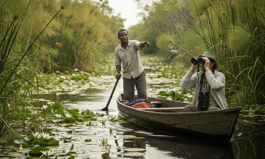 Canoe Safari: Traditional dugout canoes take you through winding waterways, providing intimate access to the swamp’s wildlife.